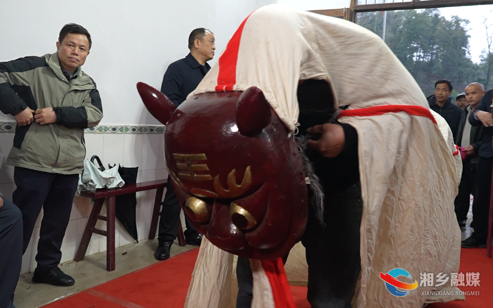 在铿锵的锣鼓声中,舞狮表演正式开场。与传统南狮、北狮不同,眼前的狮灯造型古朴,狮头为厚重木质面具,身披白布,极具湘中地区辨识度。两位表演者配合默契,步法灵动,将狮子演绎得活灵活现。只见狮子时而昂首向天,时而向观众点头纳福,白布上的狮尾随之摆动,栩栩如生。